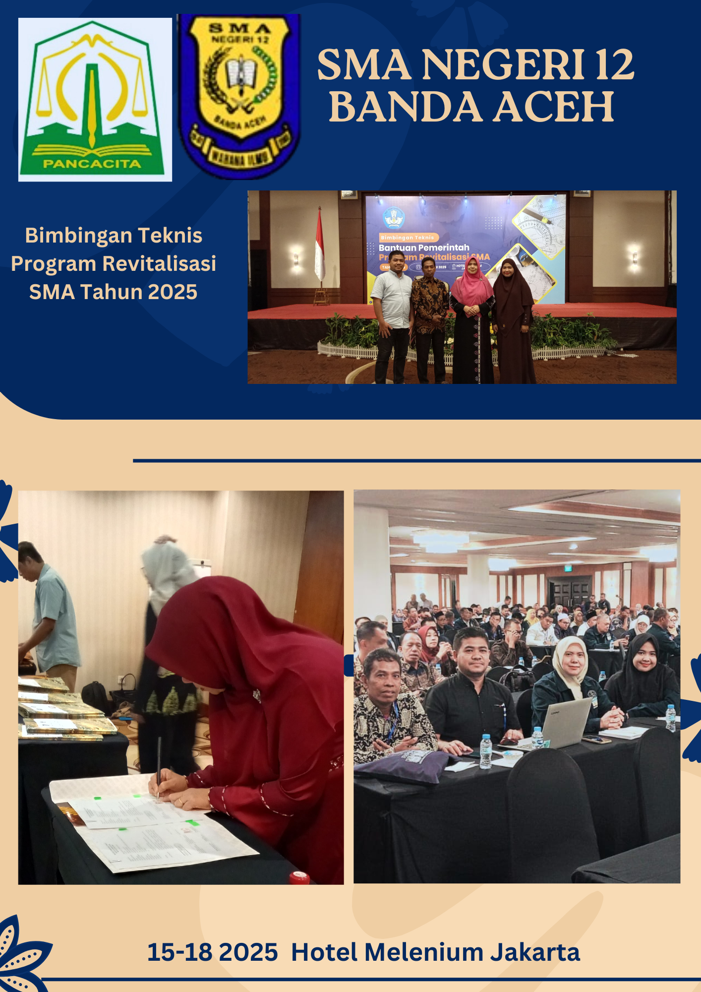 Jakarta, 15-18 Juni 2025 – SMA Negeri 12 Banda Aceh berpartisipasi dalam Bimbingan Teknis (Bimtek) Program Revitalisasi SMA Tahun 2025 yang diselenggarakan oleh pemerintah pusat. Acara ini berlangsung di Hotel Millennium Jakarta dan dihadiri oleh Kepala Sekolah, Ibu Nurjannah, S.Pd., M.Pd., serta tim revitalisasi dari sekolah.