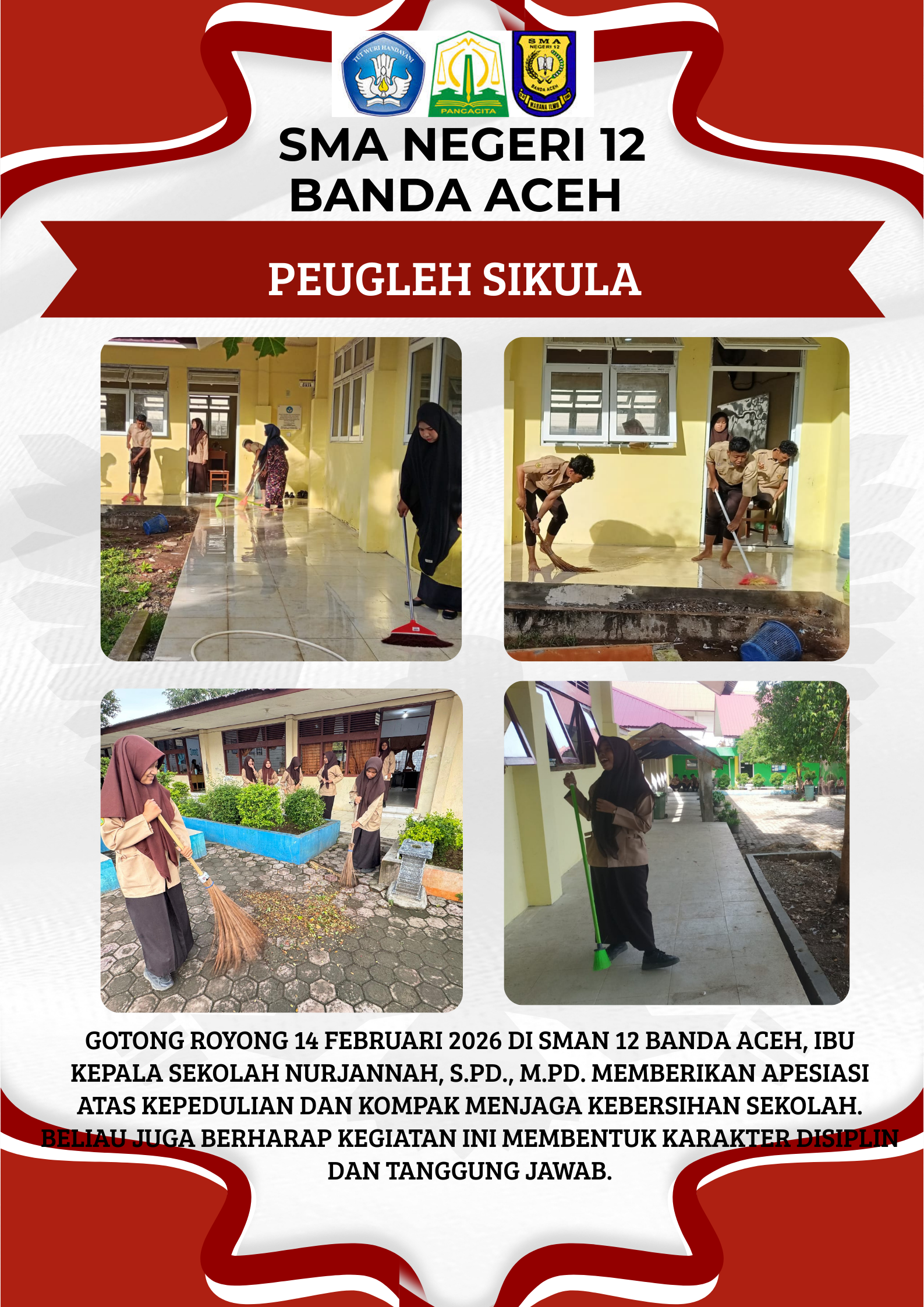 Banda Aceh, 14 Februari 2026 – SMAN 12 Banda Aceh melaksanakan kegiatan gotong royong pada pagi hari sebagai bentuk pembiasaan baik bagi seluruh warga sekolah. Kegiatan ini diikuti oleh para siswa dan guru dengan membersihkan lingkungan kelas, selasar, serta halaman sekolah secara bersama-sama.