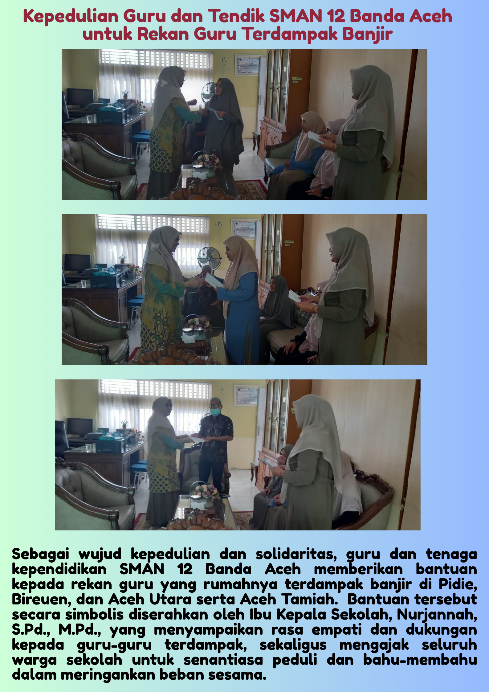 Banda Aceh — Sebagai wujud kepedulian dan solidaritas kemanusiaan, guru dan tenaga kependidikan (tendik) SMA Negeri 12 Banda Aceh menyalurkan bantuan kepada rekan guru yang terdampak banjir di sejumlah wilayah Aceh, yakni Kabupaten Pidie, Bireuen, Aceh Utara, dan Aceh Tamiang.
