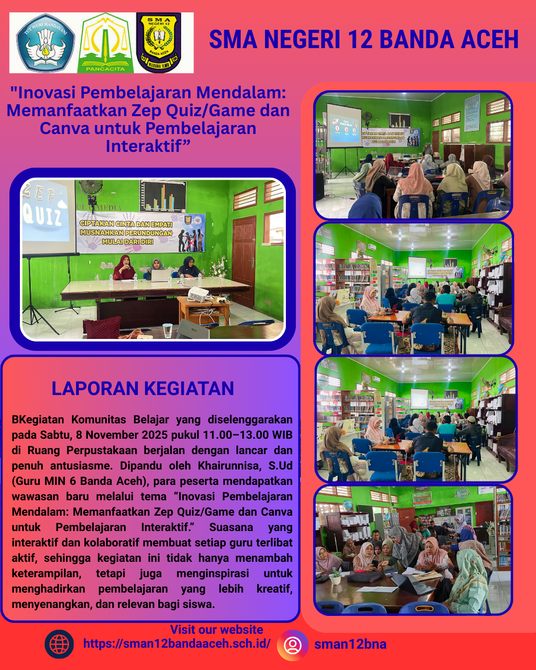 Banda Aceh, 8 November 2025 — SMA Negeri 12 Banda Aceh kembali menggelar kegiatan Komunitas Belajar sebagai bagian dari upaya meningkatkan kompetensi dan kreativitas guru dalam menerapkan pembelajaran inovatif. Kegiatan yang berlangsung pada pukul 11.00–13.00 WIB di Ruang Perpustakaan ini berjalan dengan tertib, lancar, dan penuh antusiasme dari seluruh peserta.