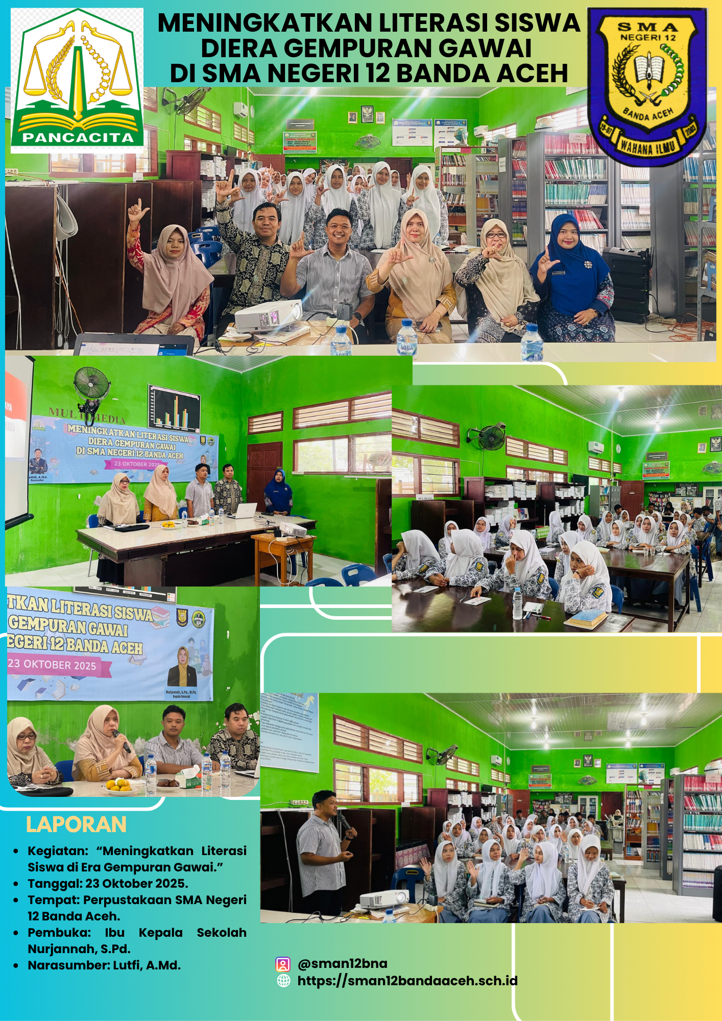 Banda Aceh, 23 Oktober 2025 – Dalam menghadapi tantangan era digital, SMA Negeri 12 Banda Aceh menggelar kegiatan sosialisasi dan diskusi bertema “Meningkatkan Literasi Siswa di Era Gempuran Gawai” yang berlangsung di aula sekolah dengan penuh antusias.