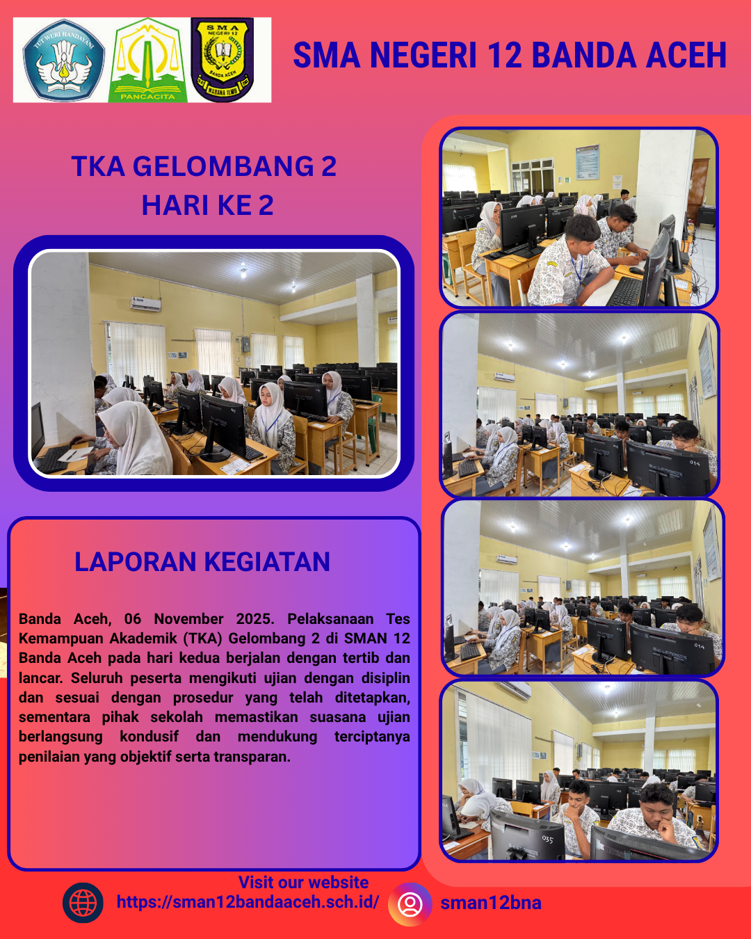Banda Aceh, 05 November 2025 — SMA Negeri 12 Banda Aceh melaksanakan Tes Kemampuan Akademik (TKA) Gelombang 2 hari kedua dengan tertib dan lancar. Kegiatan yang berlangsung di Laboratorium Komputer ini diikuti oleh seluruh siswa dengan penuh semangat dan disiplin.