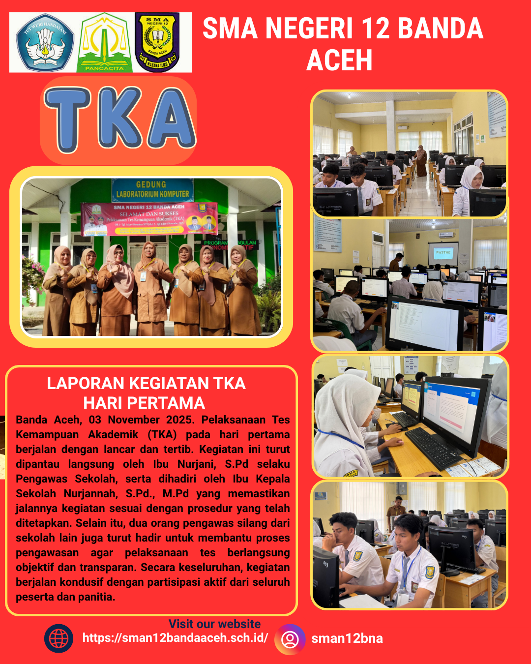 Secara keseluruhan, pelaksanaan TKA hari pertama berjalan kondusif dengan partisipasi aktif dari siswa, guru, serta seluruh panitia. Kegiatan ini diharapkan menjadi langkah awal menuju peningkatan mutu pendidikan dan prestasi akademik di SMA Negeri 12 Banda Aceh.