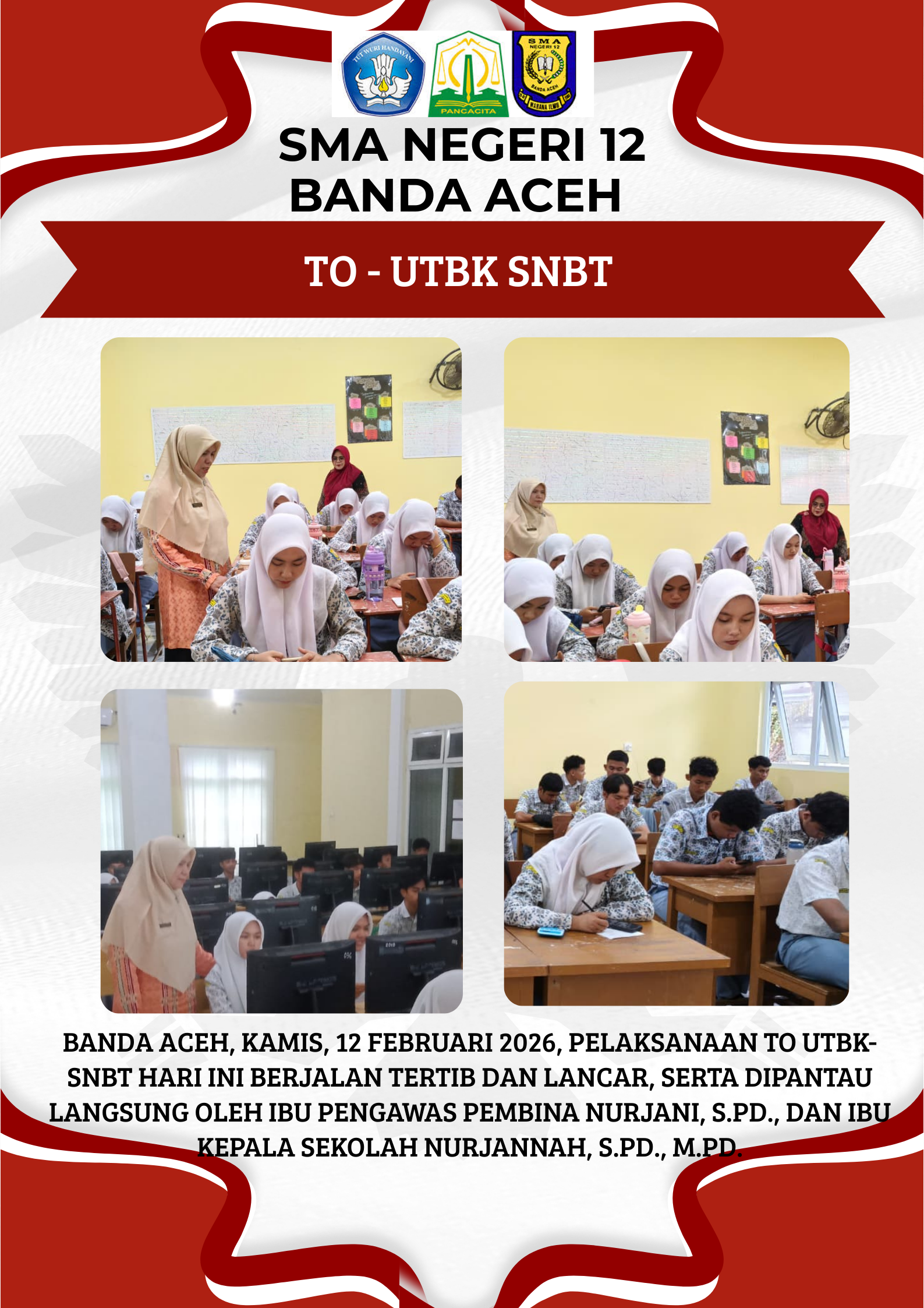 Banda Aceh, Kamis, 12 Februari 2026 — SMA Negeri 12 Banda Aceh melaksanakan kegiatan Try Out (TO) UTBK-SNBT yang diselenggarakan oleh Dinas Pendidikan Aceh bagi siswa kelas XII SMA dan SMK se-Aceh. Kegiatan ini bertujuan untuk mengukur kesiapan siswa dalam menghadapi UTBK-SNBT menuju Perguruan Tinggi Negeri (PTN).