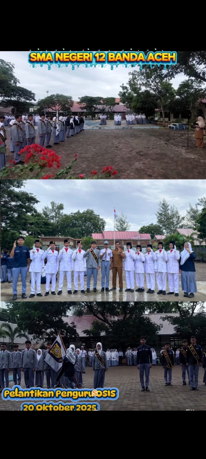 Banda Aceh, 20 Oktober 2025 — SMA Negeri 12 Banda Aceh melaksanakan kegiatan pelantikan pengurus OSIS masa bakti 2025/2026 di lapangan upacara sekolah. Kegiatan berlangsung penuh khidmat dan dihadiri oleh dewan guru, staf tata usaha, serta peserta didik dari berbagai tingkatan.