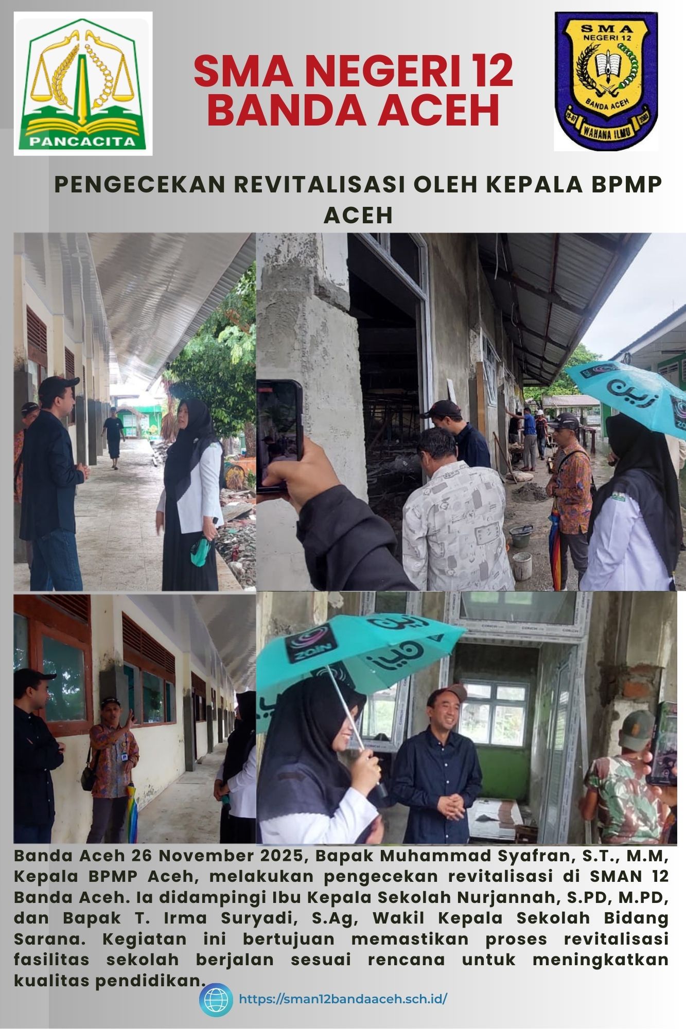 Banda Aceh, 26 November 2025 – SMAN 12 Banda Aceh menjadi tuan rumah bagi Bapak Muhammad Syafran, S.T., M.M., Kepala BPMP Aceh, dalam acara pengecekan revitalisasi sekolah yang bertujuan untuk meningkatkan fasilitas pendidikan. Acara ini dihadiri juga oleh Ibu Kepala Sekolah, Nurjannah, S.PD., M.PD, dan Bapak T. Irma Suryadi, S.Ag, Wakil Kepala Sekolah Bidang Sarana.