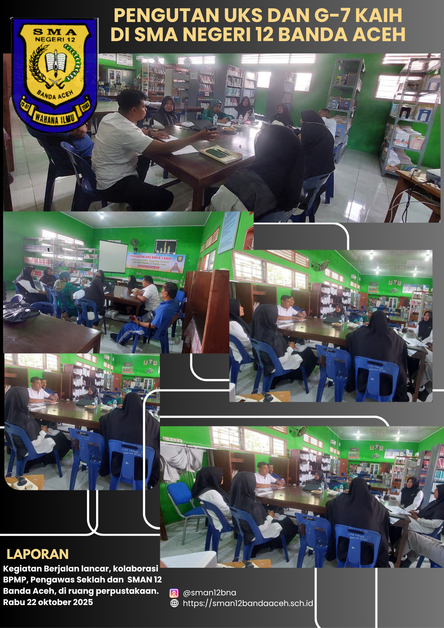 Banda Aceh, 22 Oktober 2025 — SMA Negeri 12 Banda Aceh melaksanakan kegiatan Penguatan UKS dan G-7 KAIH yang berlangsung di ruang perpustakaan sekolah. Kegiatan ini merupakan hasil kolaborasi antara Balai Penjaminan Mutu Pendidikan (BPMP), pengawas sekolah, dan pihak SMA Negeri 12 Banda Aceh.