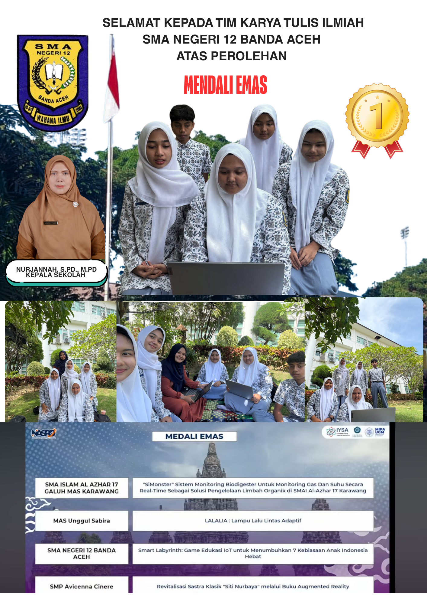 “Saya mengucapkan selamat dan apresiasi yang sebesar-besarnya kepada tim SMA Negeri 12 Banda Aceh yang telah mengharumkan nama sekolah dengan meraih medali emas. Prestasi ini merupakan bukti bahwa siswa-siswi kita mampu bersaing di tingkat nasional melalui inovasi dan kerja keras,” ungkap Ibu Nurjannah.
