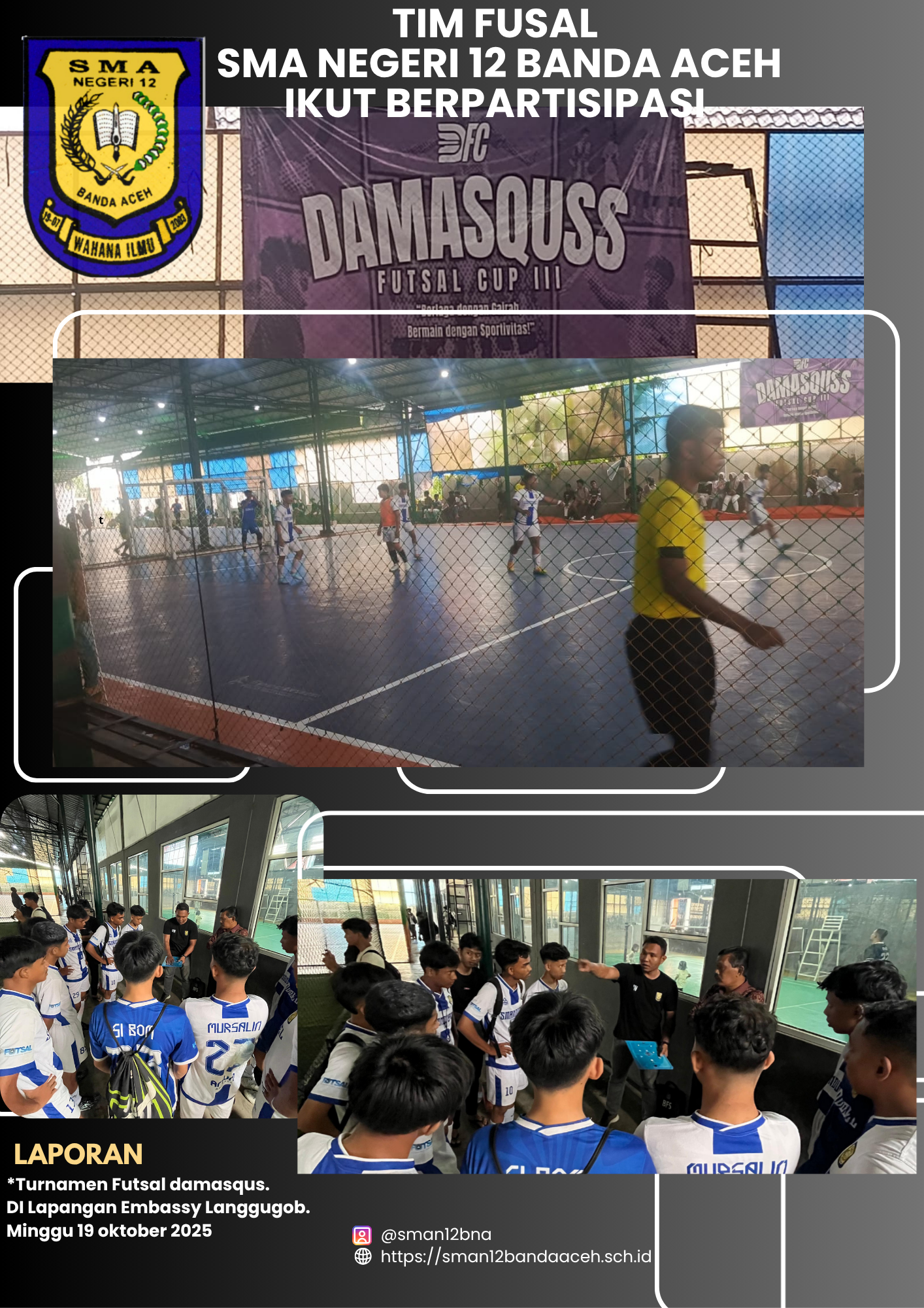 Banda Aceh – Tim futsal SMA Negeri 12 Banda Aceh kembali menunjukkan semangat juang tinggi dalam ajang Turnamen Futsal Damasqus 2025 yang digelar pada Minggu, 19 Oktober 2025, di Lapangan Embassy Langgugob. Dalam laga pembuka, kesebelasan SMA Negeri 12 Banda Aceh berhasil meraih kemenangan gemilang atas SMA Negeri 11 Banda Aceh dengan skor 2–0.