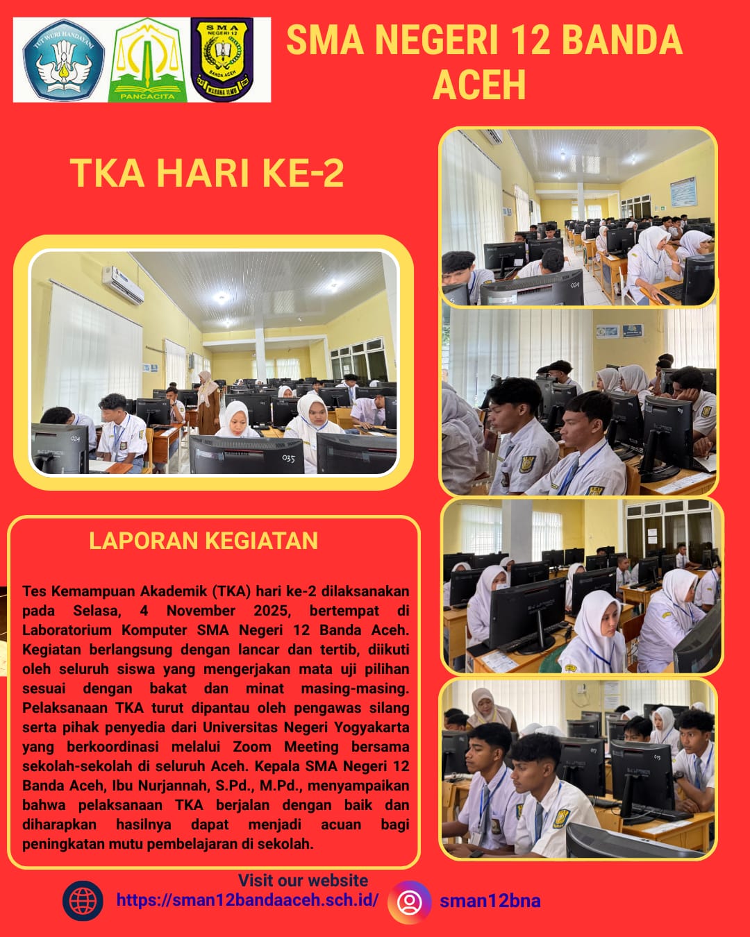 Pelaksanaan TKA hari kedua ini diikuti oleh seluruh siswa kelas XII SMA Negeri 12 Banda Aceh dari berbagai jurusan. Tes dilakukan dengan sistem Computer Based Test (CBT) agar pelaksanaan lebih efisien, akurat, dan sesuai dengan perkembangan teknologi pendidikan. Selama kegiatan berlangsung, suasana laboratorium komputer tampak kondusif, tertib, dan penuh semangat. Para siswa terlihat serius dan fokus mengerjakan soal sesuai dengan mata uji pilihan masing-masing.