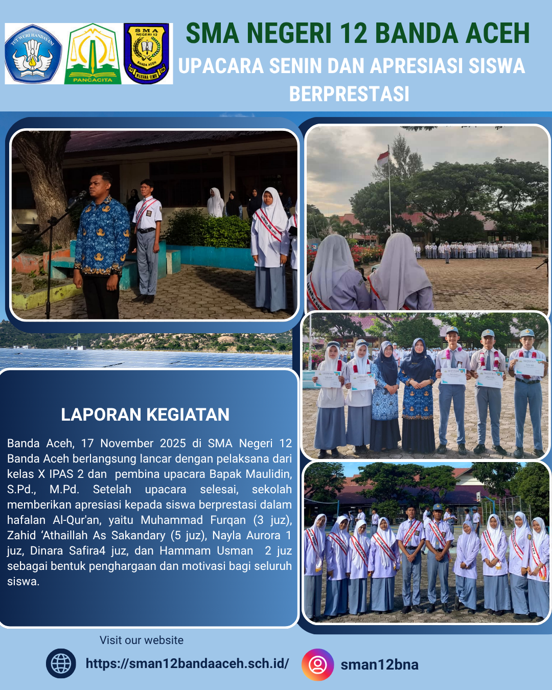 Banda Aceh, Senin17 November 2025, SMA Negeri 12 Banda Aceh kembali melaksanakan kegiatan rutin Upacara Bendera yang berlangsung di lapangan sekolah. Upacara berjalan dengan tertib, lancar, dan penuh khidmat dengan peserta upacara dari kelas X IPAS 2 sebagai pelaksana.