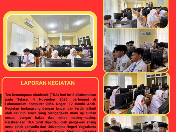 Banda Aceh, 10 Februari 2024 – SMAN 12 Banda Aceh mengadakan upacara bendera yang dipimpin oleh Ibu Rosmaniar sebagai pembina upacara. Dalam amanatnya, Ibu Rosmaniar menyampaikan pesan motivasi kepada seluruh siswa untuk terus giat belajar dan bertekad mencapai prestasi yang lebih baik. Beliau mengingatkan pentingnya disiplin dan kerja keras dalam mencapai cita-cita.